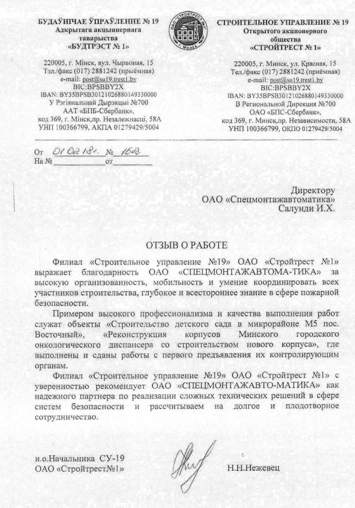 Филиал «Строительное управление №19» ОАО «Стройтрест №1» с уверенностью рекомендует ОАО «СПЕЦМОНТАЖАВТОМАТИКА» как надежного партнера по реализации сложных технических решений в сфере систем безопасности и рассчитываем на долгое и плодотворное сотрудничество.